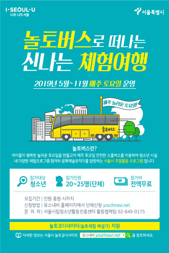 프로그램 개요 - 운영기간: 2019.05.04(토) - 11.16(토) / 총 100회 - 신청기간: 참가 완료시까지 - 신청대상: 서울시 내 청소년(20명 - 25명)(청소년포함 25명, 단체만 신청가능) - 활동내용: 서울시 내 청소년시설 및 문화예술지 체험프로그램 참가 - 참 가 비: 무료(체험비, 입장료, 식사, 간식 포함) - 신청방법: https://www.youthnavi.net/event/noltobus/noltobus2019_info.jsp 으로 접속하여 원하는 시간, 체험지 신청
