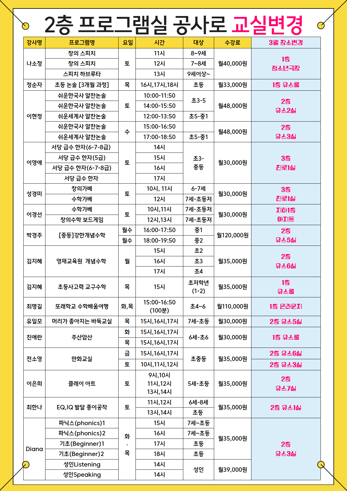 | 3월) 2층 프로그램실 공사 및 일부 수업 장소 변경 안내 (센터의 모든 프로그램은 정상 운영) NEW |